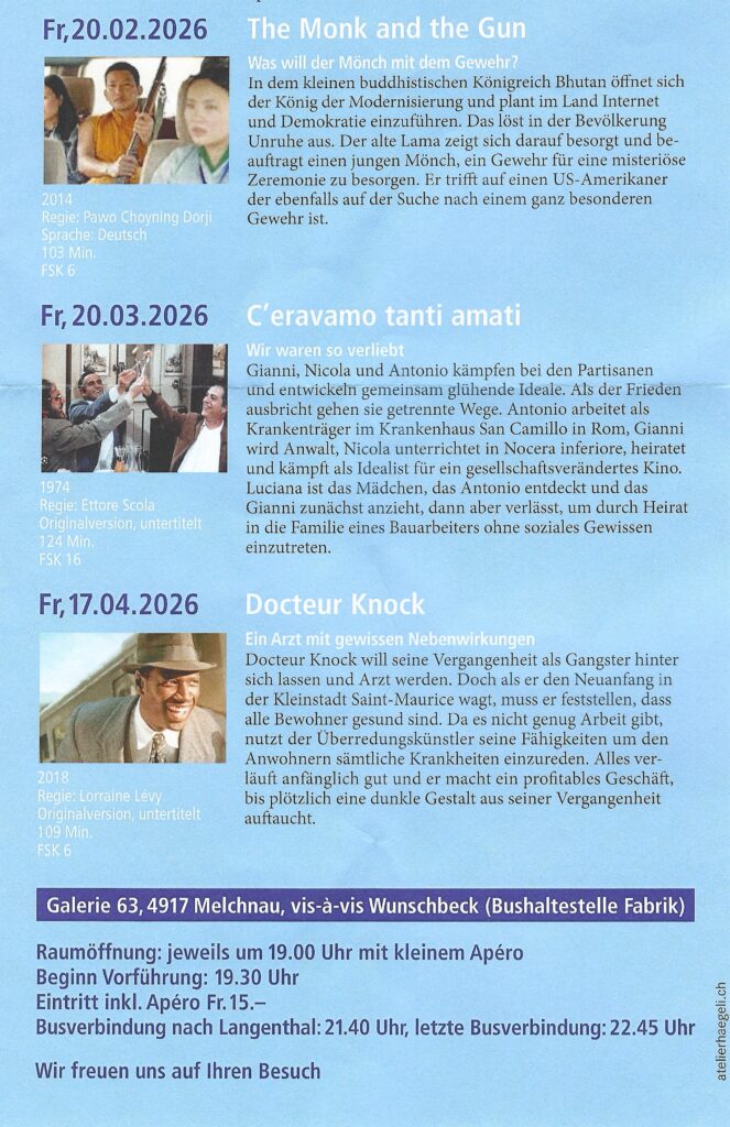 Die Filme werden in der Galerie 63 an der Dorfstrasse 63 in Melchnau gezeigt.